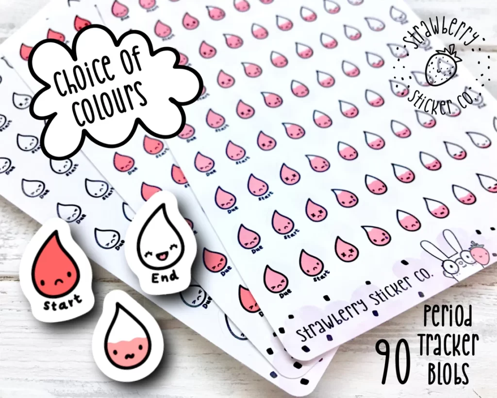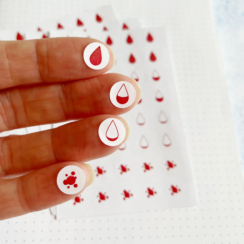 Wanneer was het ook alweer zover? Voorkom twijfel en plak een menstruatiesticker in de agenda. De keuze is reuze. Op Etsy.com zagen we period trackers in alle kleuren en vormen; maandverbanden en tampons uiteraard. Maar ook vervaarlijke haaien (in het Engels betekent shark week ‘ongesteld’), bloeddruppels, taartjes, slips en meer. Shop till you drop! Een kleine selectie.